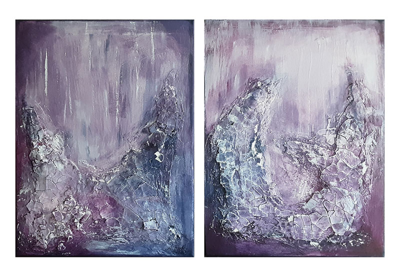 266 Violette Täler 7. Dezember 20217. Dezember 2021 | Angela Größe: jede der beiden Leinwände: 30 x 40 cm Acrylmalerei mit Materialeinsatz auf Leinwand